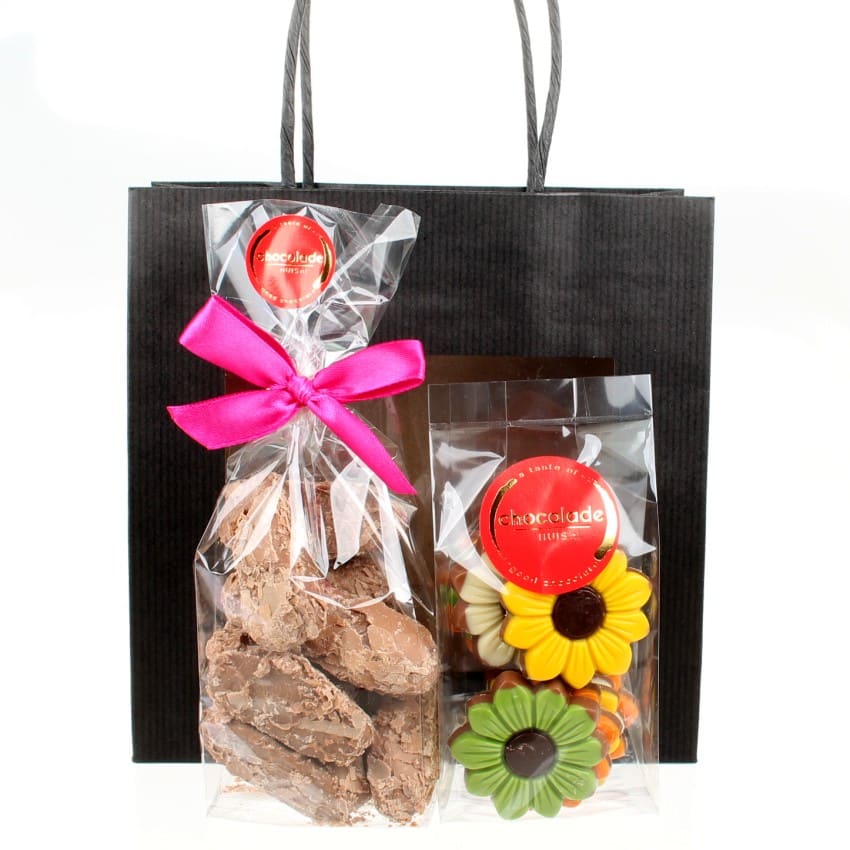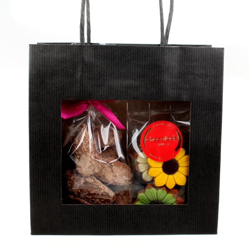 Een tasje met een zakje van 125 gram met heerlijke en vrolijke bloemen en een zakje met 170 gram luxe schilfertruffels. Een keer geen klassieke bonbons geven, maar een zakje vrolijke bloemen en onze heerlijke schilfertruffels met een roomvulling zijn de perfecte combinatie om iedereen mee te verassen!