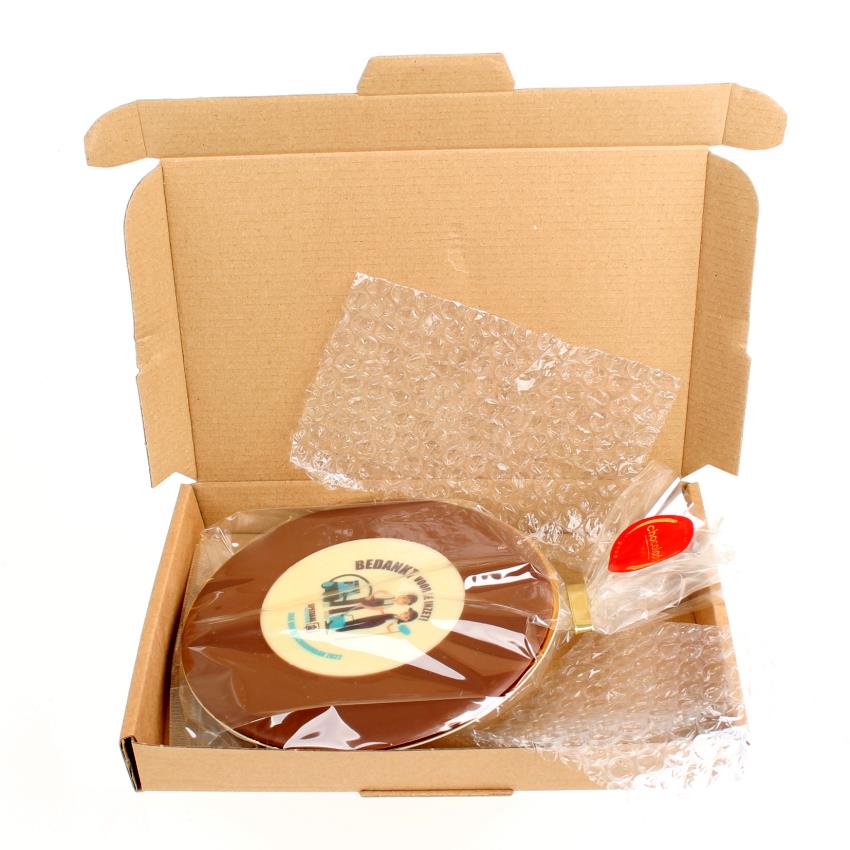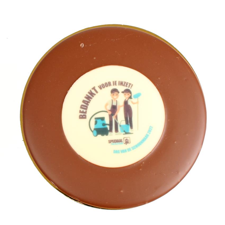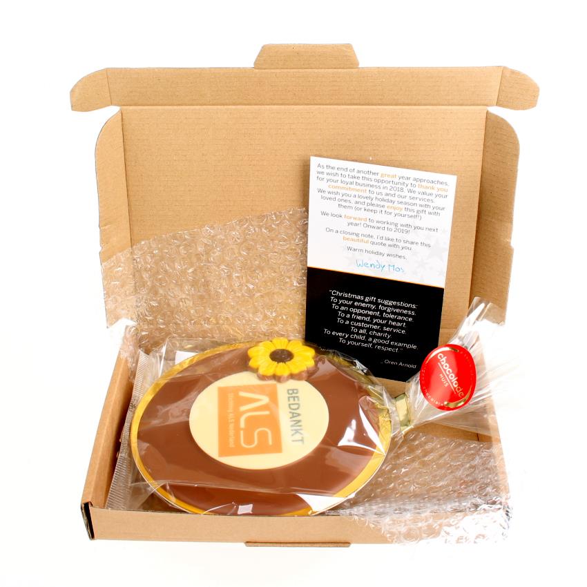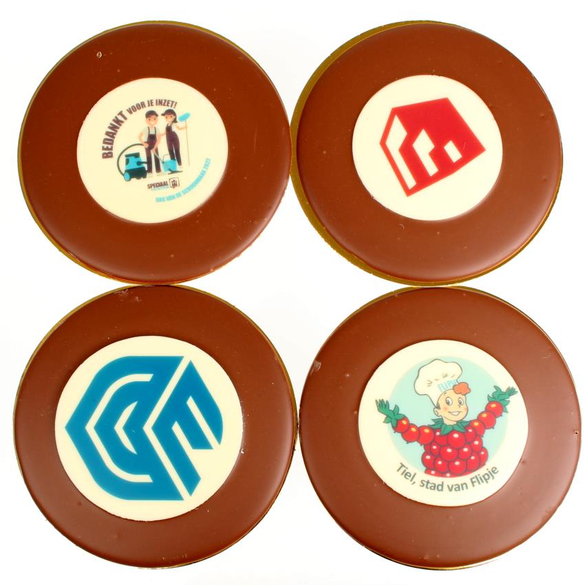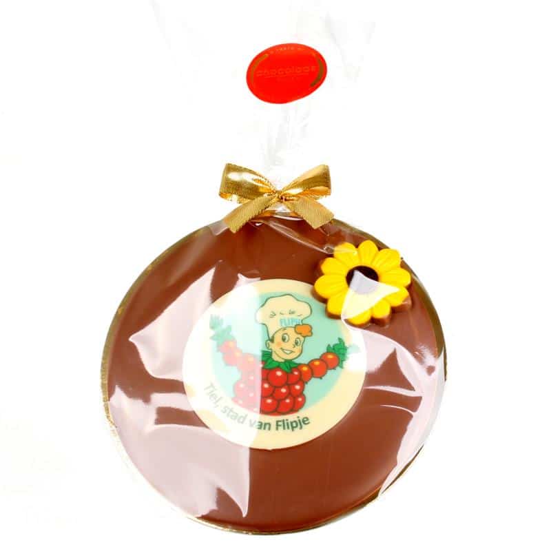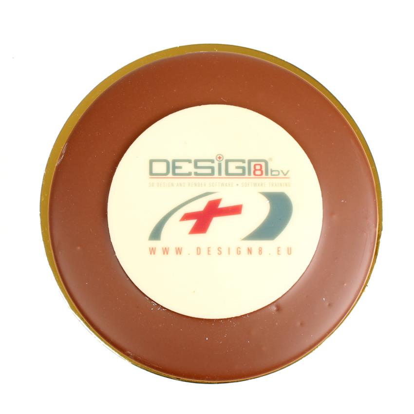 Een chocolade geschenk met bedrijfslogo gemaakt van heerlijke chocolade. Deze ronde plak chocolade weegt circa 200 gram en wordt eventueel met een bloem gedecoreerd. Dit geschenk is zeer geschikt voor brievenbuspost. Deze ronde plak wordt verpakt in een transparant zakje (eventueel met een kaart in een verzenddoosje). Deze op maat gemaakte attentie is een lekker geschenk voor een kleiner budget. Voor dit product dient u het bedrijfslogo in een jpg-bestand aan te leveren.