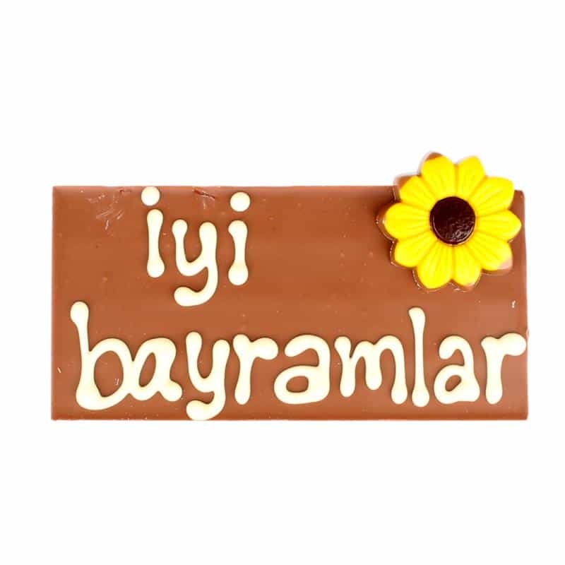 Wat is nu een beter idee dan een heerlijk stuk chocolade weggeven aan het eind van de Ramadan! Een reep van de lekkerste chocolade met daarop handgeschreven “Eid Mubarak”. De reep weegt circa 100 gram en wordt per stuk feestelijk kin transparante folie verpakt. De reep is naar keuze beschikbaar in Eid Mubarak of Iyi bayramlar.
