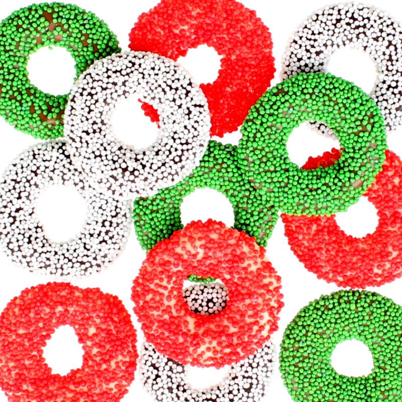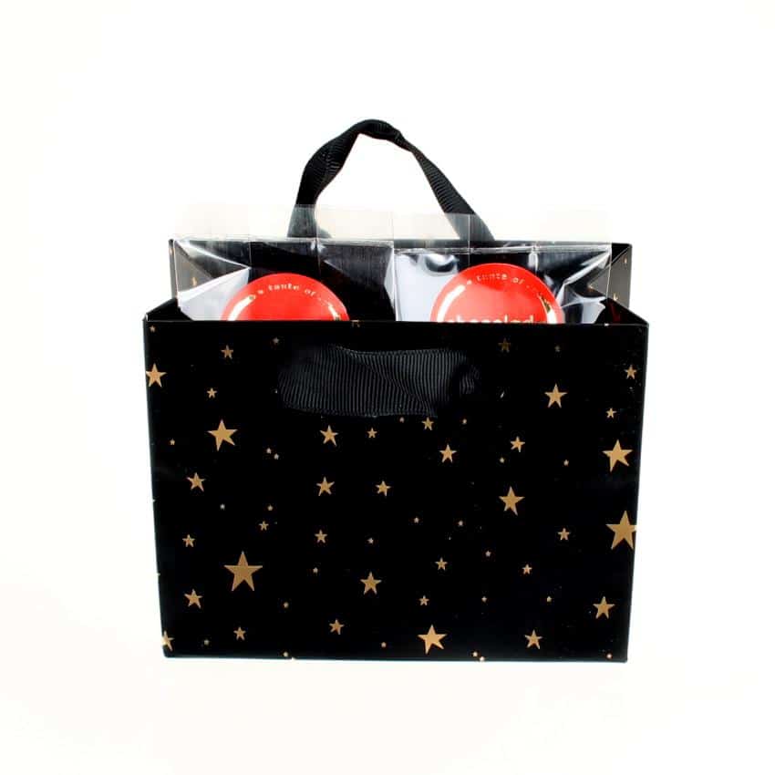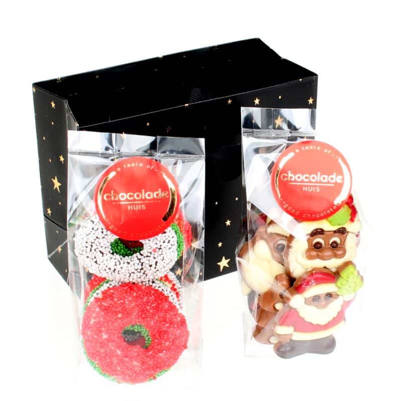 Een chocolade kerstgeschenk van 250 gram in een tasje met 2 verschillende chocolade producten. Vrolijke luxe chocolade kerstfiguurtjes samen met de altijd populaire musketkransen.