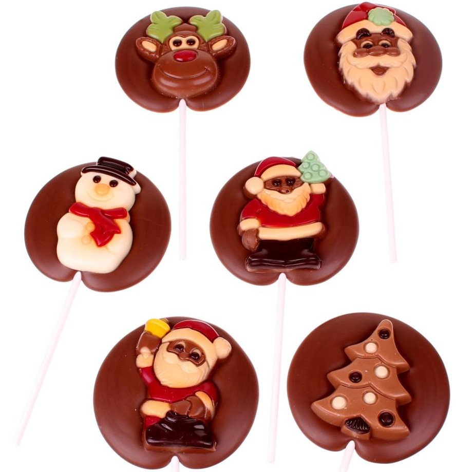 Een chocolade kerstlolly is een klein aardigheidje voor kinderen, een lekkere traktatie met een echte kerstuitstraling. De lolly wordt gemaakt met een van deze kerstfiguurtjes of een vrolijke mix van kerstfiguurtjes.