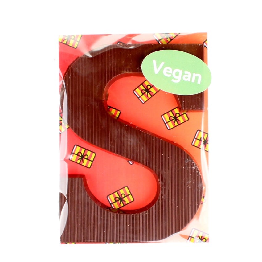Deze kleine vegan chocoladeletter (Lactosevrij) is gemaakt van melk chocolade op basis van rijstmelk. Hierdoor bevat de letter geen dierlijke producten en is deze vegan. Deze letter is alleen beschikbaar in de letter “S”, maar wel naar keuze in melk op basis van rijstemelk of puur. De letter weegt ca. 100 gram en wordt vrolijk verpakt met een kaart erachter.