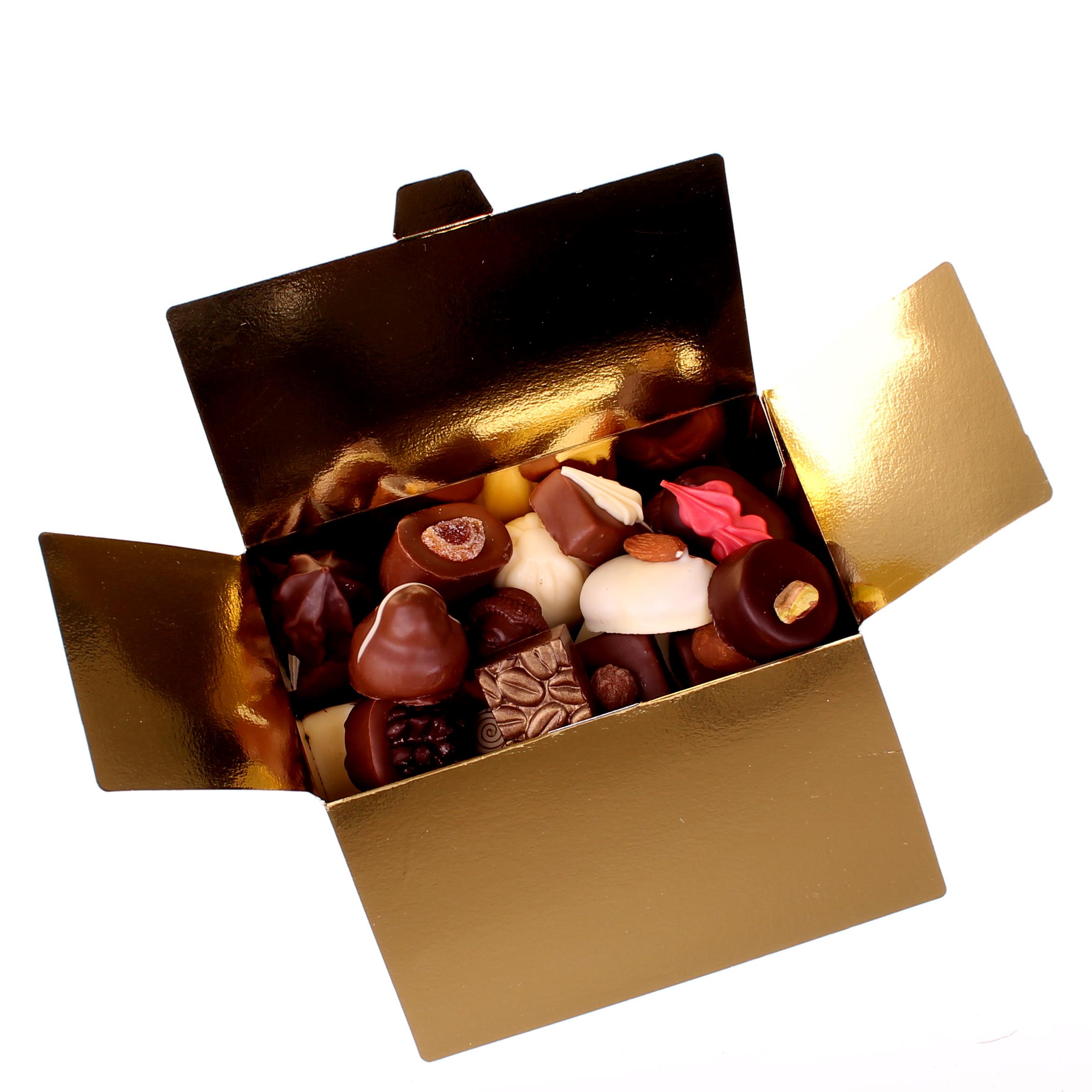 Een luxe doos gevuld met 450 gram ambachtelijk handgemaakte bonbons. De verpakking geeft dit chocoladegeschenk een extra luxe uitstraling en zal het goed doen als zakelijk geschenk bij relaties of medewerkers.