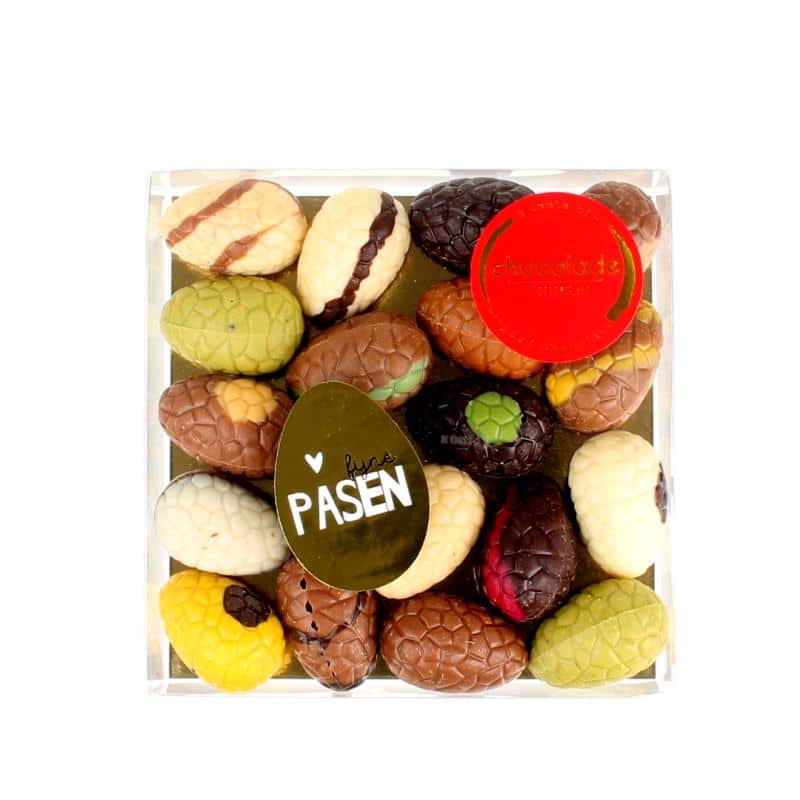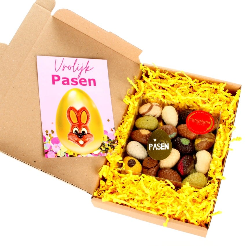 Een grotere doos met luxe bonboneitjes voor brievenbusverzending. Deze paaseitjes voor brievenbus passen dus makkelijk door de deur en zijn ideaal om cadeau te geven. Bonboneitjes voor brievenbus zijn perfect als verrassing voor vrienden of familie tijdens Pasen. Circa 300 gram van de lekkerste paaseitjes die er zijn. Een mooie verrassing voor heerlijke paasdagen!