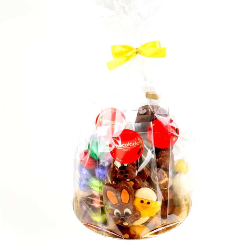 Een paasgeschenk is altijd een feestelijk cadeau om te krijgen. Dit leuke Paaspakket vol paaschocolade bestaat uit een zakje van 125 gram paasfiguurtjes, 125 gram luxe paaseitjes, 250 gram lekkere folie-eitjes en een plat paasei gedecoreerd met een haasje. Alle producten worden in folie ingepakt. Een mooi geschenk voor het paasweekend!