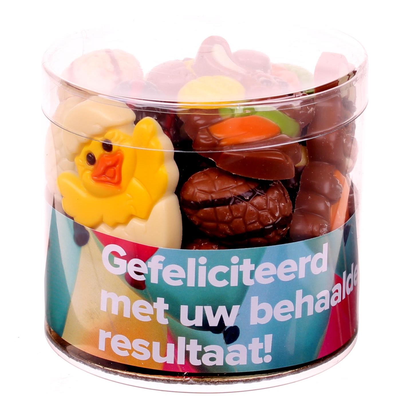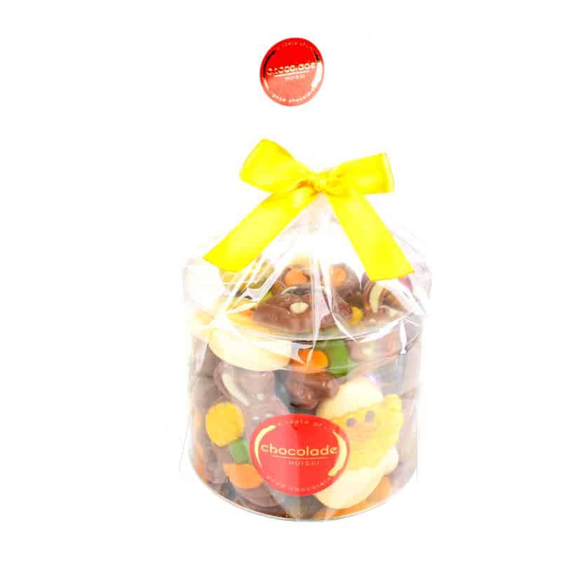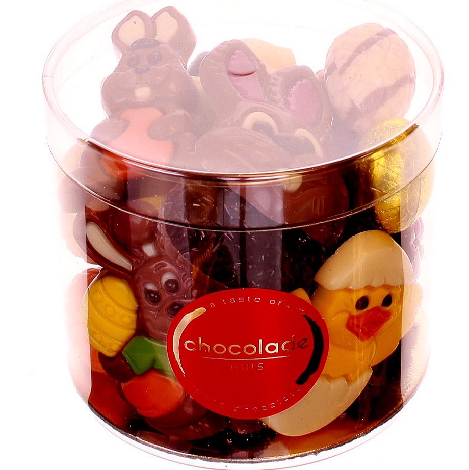 Een koker gevuld met 375 gram gemengde paaschocolade. Als je op zoek bent naar een paasgeschenk met een vrolijke uitstraling en toch een flinke portie paaschocolaatjes, dan is dit een uitstekende mogelijkheid.