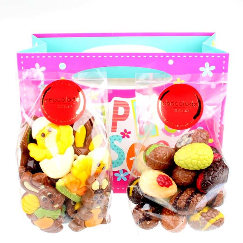 Een kleurrijk tasje gevuld met een luxe bonboneitjes en vrolijke chocolade paasfiguurtjes. Dit zijn absoluut paaseitjes en paaschocolade in vrolijk tasje. Samen 500 gram van de lekkerste paaschocolade. Alles bij elkaar een zeer smakelijk cadeau om weg te geven!
