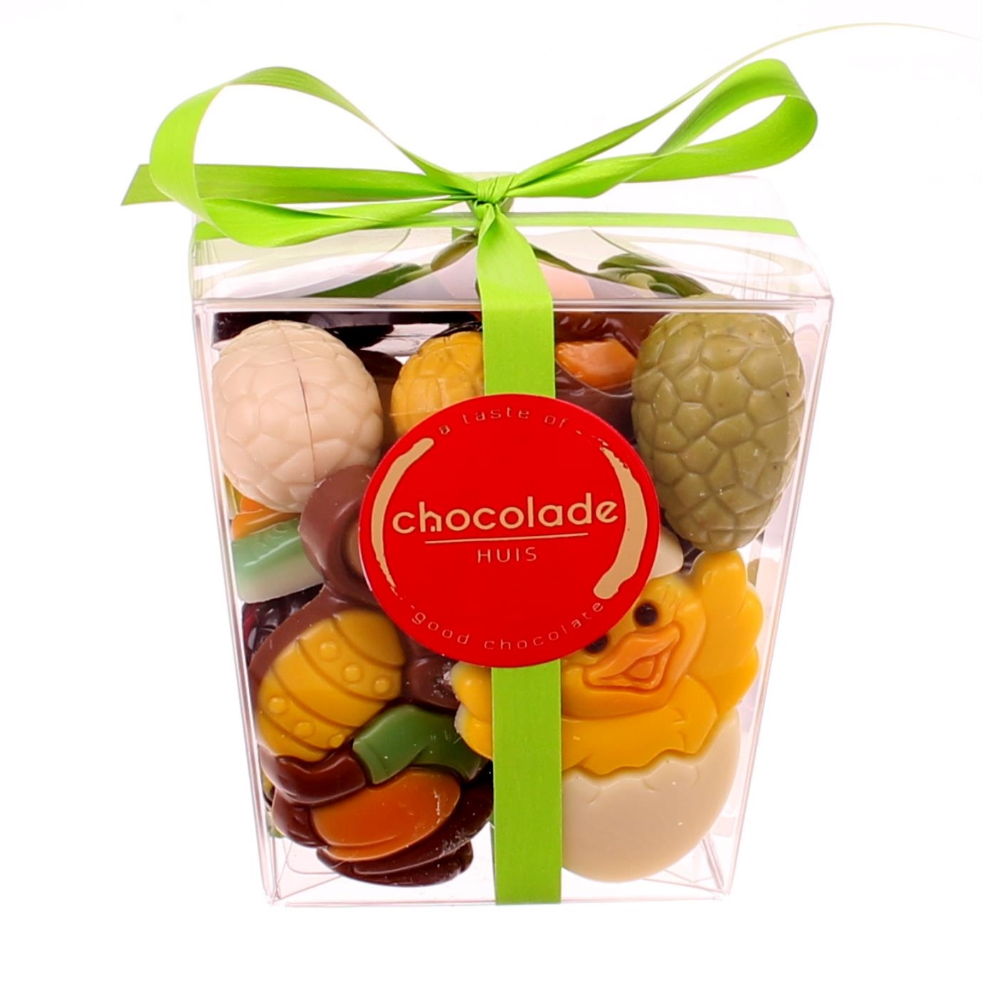 Een mooi transparant doosje van 275 gram gevuld met een mix van paaseitjes en vrolijke paaschocolade. Heerlijke Belcolade chocolade van de beste kwaliteit. Daarnaast is er een mogelijkheid om dit product alleen met paaseitjes te bestellen.