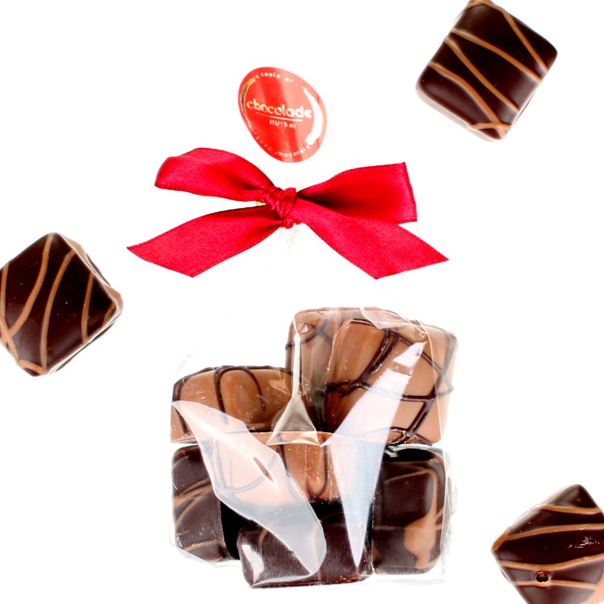 Een zakje romige schilfertruffels (ca. 160 gram), een zakje chocolade tulpen (125 gram), zakje chocolade bloemen (125 gram) en een zakje chocolade fudge-bonbons. Alle producten van de beste kwaliteit chocolade. Het pakket wordt verpakt in een feestelijk tasje.