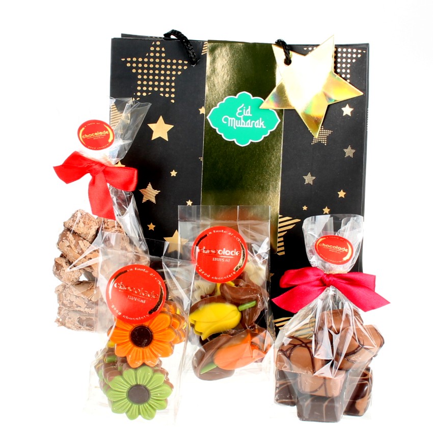 Een heerlijk chocolade pakket om te geven voor Eid Mubarak. Het pakket bestaat uit: