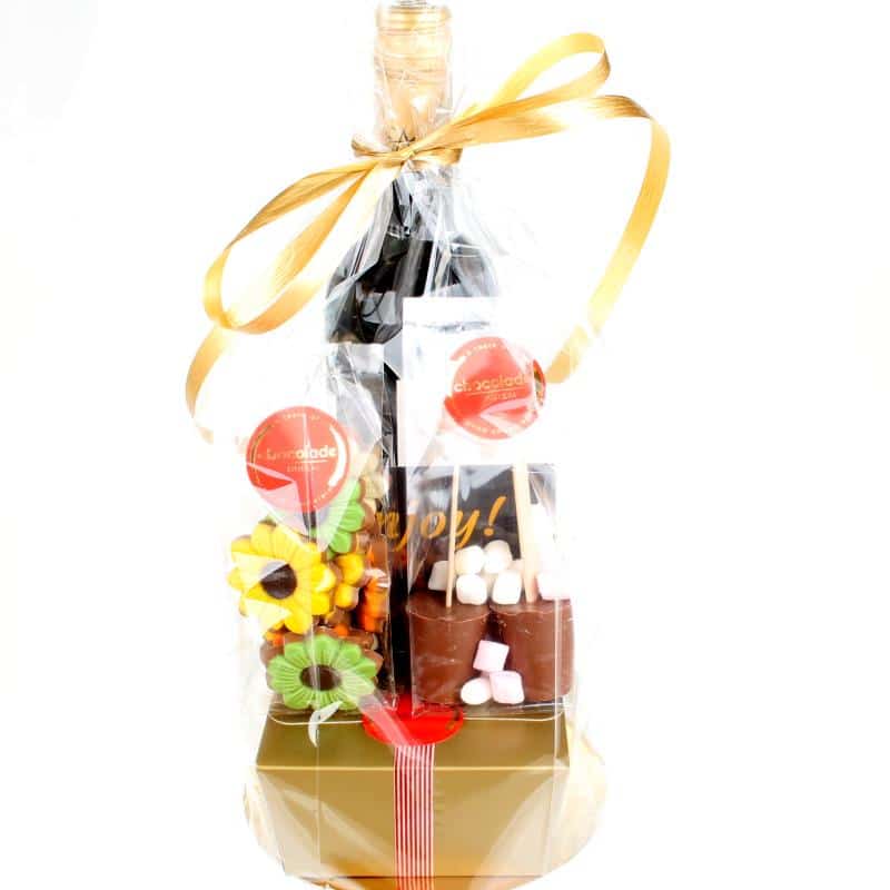 Wijn en Chocolade, een heerlijk maar zeker ook feestelijk chocolade pakket met een lekkere fles rode wijn. Het pakket bevat 250 gram handgemaakte bonbons, 125 gram vrolijke chocolade bloemen, 2 stuks chocolademelk sticks met marshmallows en een fles wijn.