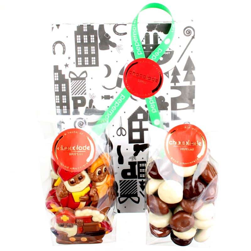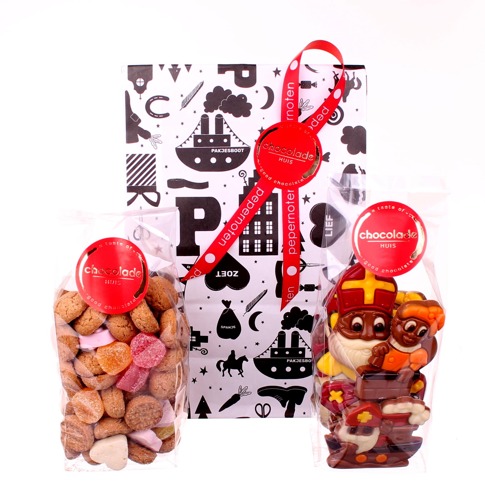 1 Gevuld met een zakje chocolade Sinterklaasfiguurtjes van ca. 125 gram en een zakje chocolade pepernoten van 150 gram